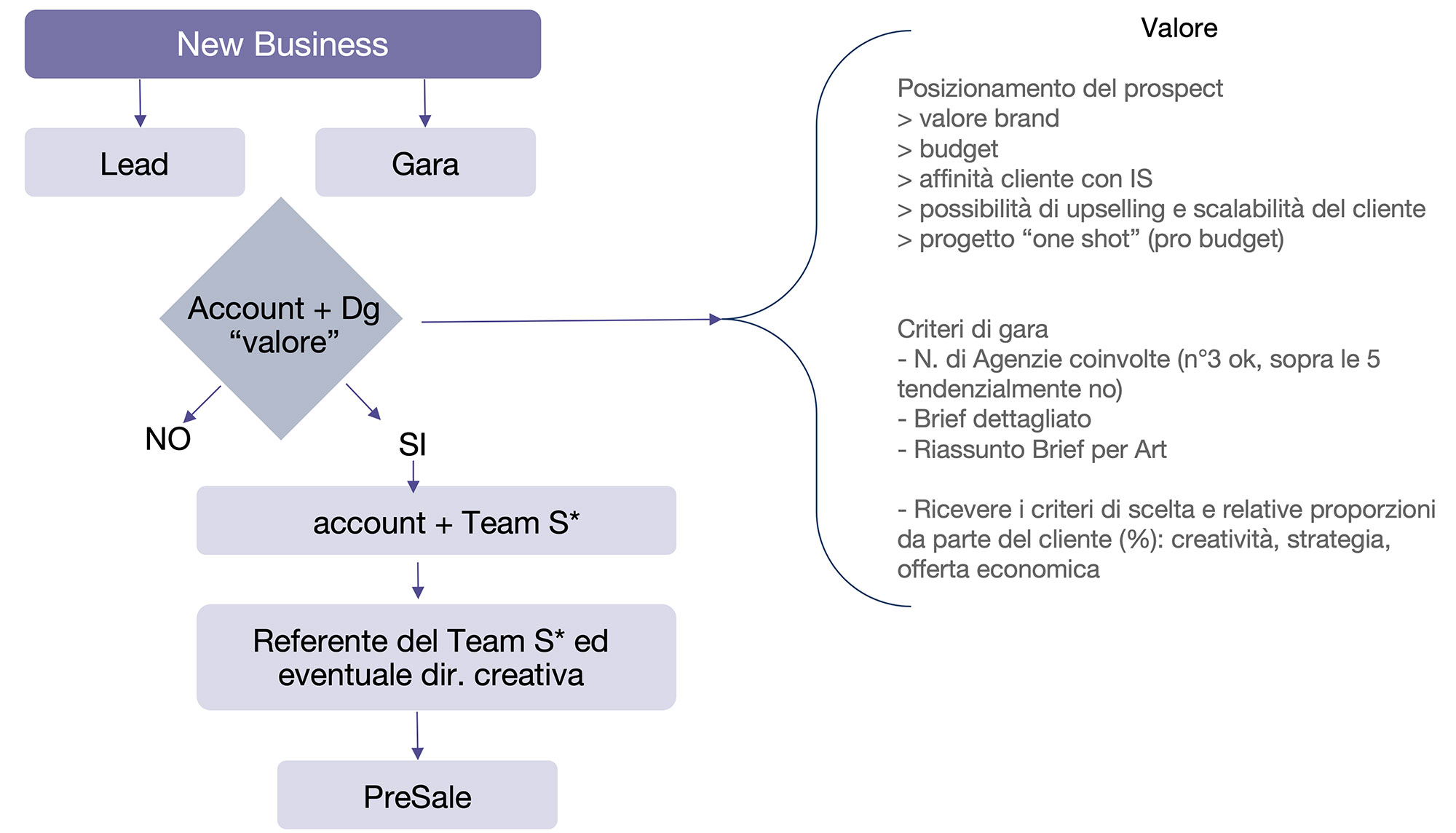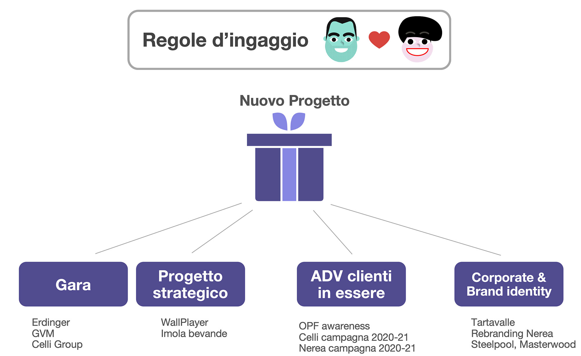 Per i progetti di presales, rinnovi, gare o presentazioni strategiche, organizzandosi con il necessario anticipo, l’account può fare affidamento sull’Head of Art che ne dispone la lavorazione con il team creative.