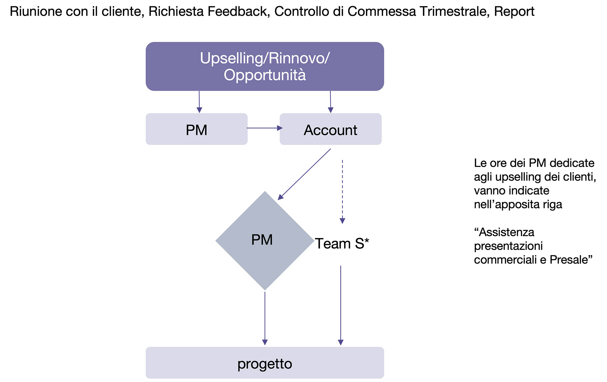 Attorno al* Project Manager (PM) ruotano l’erogazione del servizio al cliente e la gestione della commessa. Nel dettaglio, interviene per
